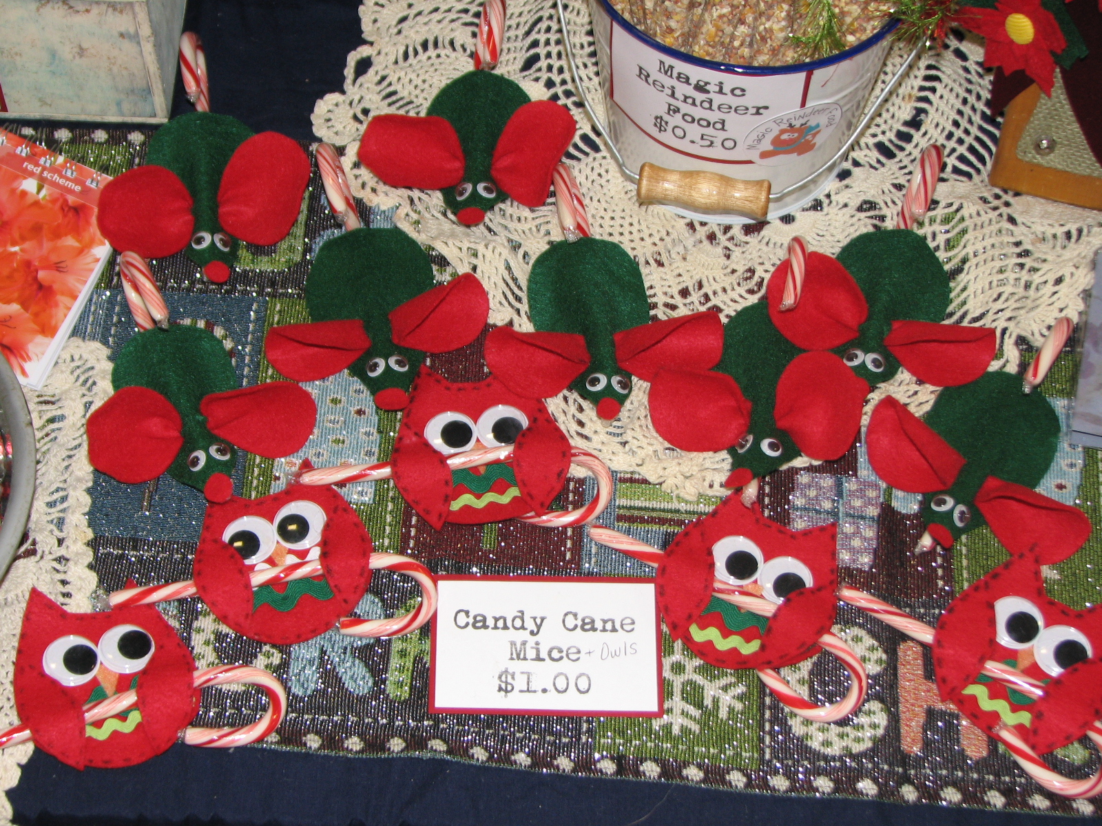ReplyDeleteWonderful display of all your lovely items! Our church's Holiday Fair was last Saturday and the things that did the best were all food related - the Cookie Walk, the baked goods table and the fudge table. Very few crafts and knitted items sold. This has been the trend here in Maine for the last three years. I hope you do share your owl candy cane holder as I would love to make some for my grandson's class. I have done the mice already.